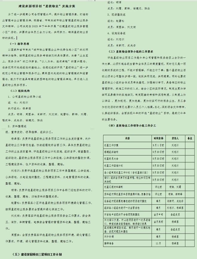 為順利通過(guò)星級(jí)考評(píng),公司領(lǐng)導(dǎo)高度重視創(chuàng)星工作,提前部署,專門召開了“建設(shè)家園”項(xiàng)目創(chuàng)星工作啟動(dòng)會(huì),成立創(chuàng)星工作小組,保障“建設(shè)家園”小區(qū)物業(yè)服務(wù)中心順利開展創(chuàng)星工作。“建設(shè)家園”創(chuàng)星工作小組組長(zhǎng)由副總劉志洲擔(dān)任,執(zhí)行組長(zhǎng)由分公司負(fù)責(zé)人楊卓恒擔(dān)任,會(huì)上組長(zhǎng)對(duì)創(chuàng)星工作做出了整體安排,任務(wù)合理分解,按照分工劃分資料組、現(xiàn)場(chǎng)組和設(shè)備組等。